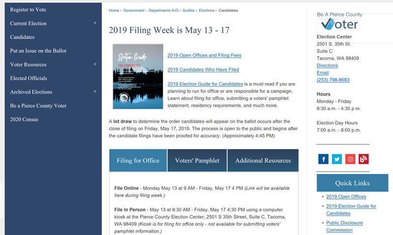 Whether you are running for office or a dedicated voter, visit the Pierce County Auditor’s Office website: https://www.co.pierce.wa.us/329/Candidates